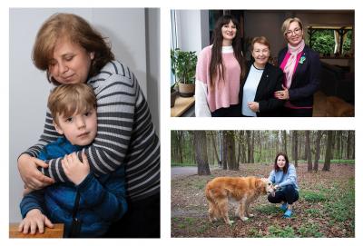 A sinistra: Olena Morhun abbraccia suo figlio Vitalii. "A volte un'immagine dice più parole di una parola", dice la fotografa dello staff del RI Monika Lozinska. In alto a destra: Da sinistra: Weronika Kowalska, Krystyna Wilczyńska-Ciemięga e Dorota Wcisła, caporedattore di Rotary Polska. "Krystyna è probabilmente conosciuta da tutti i Rotariani del suo distretto", ha dichiarato Wcisła. "È una persona cordiale, amichevole e di buon carattere che condividerebbe ciò che ha con chiunque abbia bisogno di aiuto. Quando in una riunione con i Rotariani dico che andrò a trovare Krysia, tutti mi chiedono di salutarla. Così le porto tanti saluti dai Rotariani di Lublino e Zamość. A casa sua c'è una grande atmosfera familiare. Weronika insegna loro il polacco e al mattino accompagna i bambini a scuola. Condividono le pulizie, il bucato e la cucina e si accordano senza problemi, proprio come una buona famiglia felice". In basso a destra: Ulzana Shakirova si ferma in un parco mentre passeggia con il cane di Wilczyńska-Ciemięga. "Qui non c'è guinzaglio; lui la ascolta", si meraviglia Lozinska. "È venuto da lei quando lo ha chiamato nel parco. Se il cane è in grado di adottarti in questo modo, vuol dire qualcosa. Gli animali non si fidano di nessuno così facilmente".