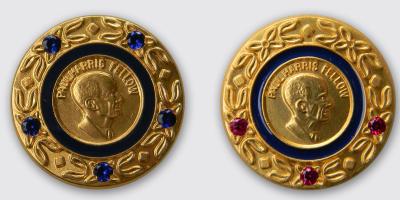 1969年にホノルルで開催されたロータリー国際大会で新しいポール・ハリス・フェローのメダルを愛でるA.Z.ベイカー1955-56年度RI会長