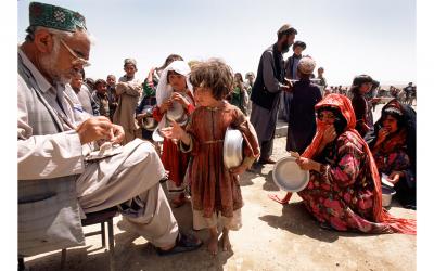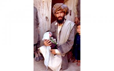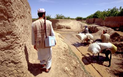 하나가 더 있습니다. 아프가니스탄에서 쿨러를 들고 걷는 남자의 모습이죠. 저는 가가호호 방문하는 보건요원들을 따라다니며 하루를 보내곤 했어요. 2002년에는 경찰 호위 없이 할 수 있었지만 그 이후에는 위험해졌어요.