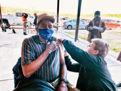 노스캐롤라이나주 트렌턴 로타리클럽의 존 홀 회장이 존스 카운티 예방접종의 날에 1차 코로나19 백신을 투여받고 있다.