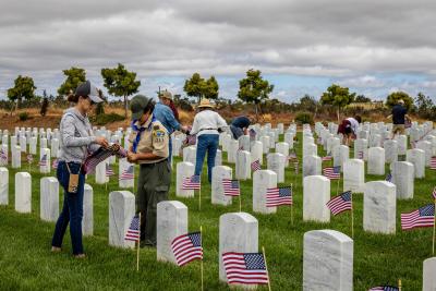 Inspirado pelas bandeiras americanas colocadas ao lado de lápides em cemitérios militares, Rick Clark perguntou às autoridades do Cemitério Nacional de Miramar, em San Diego, se os Rotary Clubs poderiam prestar homenagem a associados do serviço militar ali enterrados. Clark, ex-presidente do Rotary Club de La Jolla Golden Triangle, é um veterano da guerra no Vietnã que serviu como Seabee, como são chamados os membros dos batalhões de construção da marinha dos EUA. Com a ajuda de líderes do Distrito 5340, ele recrutou 400 voluntários para participar do projeto, chamado de 2024 Operation Flags for Vets. “Foi um evento poderoso que impactou muitas pessoas, incluindo inúmeros sobreviventes que expressaram sua gratidão”, diz outro organizador, Michael Fuqua, associado do Rotary Club de Rancho Bernardo e capitão naval aposentado. O distrito planeja repetir o evento este ano. A iniciativa é apoiada por uma nova comissão distrital formada para coordenar projetos relacionados a militares e veteranos que ajudou a arrecadar cerca de US$ 14 mil.