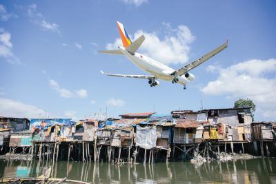 McCurry: esta fotografia tem uma forte justaposição que traduz bem os dois lados da sociedade. Na parte de baixo estão as pessoas pobres, que vivem em situação extremamente precária, para as quais o dia a dia é um constante teste de sobrevivência. Já na parte de cima, estão as pessoas mais abonadas, para quem a vida foi mais generosa, indo de um lado para o outro, a passeio ou a negócios. Esta imagem nos faz refletir sobre o que deve ser morar neste lugar, com o barulho ensurdecedor dos aviões a lembrar da uma condição sofrida. O contraste entre a parte de cima e a de baixo é chocante.