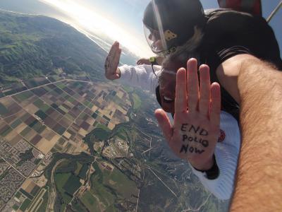 É sempre interessante ver as pessoas saltando de paraquedas, e aqui vemos o detalhe da campanha do Rotary contra a pólio. A expressão da moça é amigável e confiante. Pode parecer que não, mas houve bastante planejamento para clicar este momento.