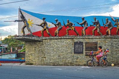 McCurry: de novo vemos mais um bom exemplo do uso de justaposição. Temos em cima estas estátuas em poses dramáticas, e embaixo algo corriqueiro, um menino passando de bicicleta. Tanto na parte de cima quanto na de baixo temos o apelo visual da bandeira. A repetição deste objeto, com a diferença de como está sendo usado, faz desta uma imagem forte.