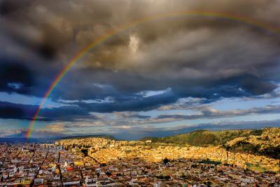 McCurry: o tema pode não ser nenhuma novidade, mas este arco-íris tem algo incomum. O céu escuro de cima vai dando lugar no horizonte ao céu azul, e temos esta luz magnífica por cima da cidade. Todos nós já vimos várias fotos de arco-íris, mas esta nos dá o contraste entre o escuro ameaçador e a luminosidade reveladora sobre o conglomerado humano.