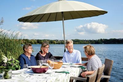 O lago Küchensee, um dos quatro lagos de Ratzeburg, serve de cenário para o almoço com a irmã de Holger, Barbara (à esquerda), e a irmã de Susanne, Sabine (à direita).