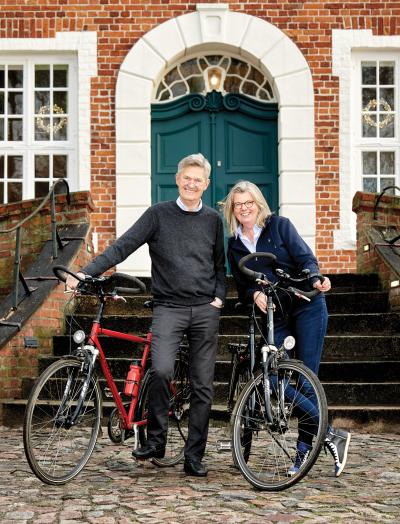 Muito ativos e apaixonados pela vida ao ar livre, Holger e Susanne param para descansar em frente ao museu de história regional de Ratzeburg.