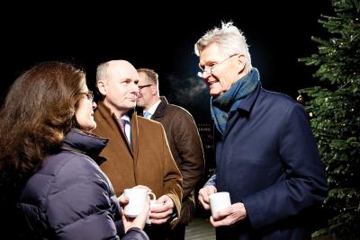 Durante a festiva de Natal do Rotary Club de Herzogtum Lauenburg-Mölln, em dezembro, Holger conversa com Barbara Hardkop e seu marido, Gerrit (Jan Schmedes está ao fundo).